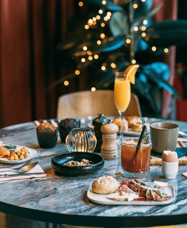 A glass of champagne on arrival and buffet-style brunch with festive treats!